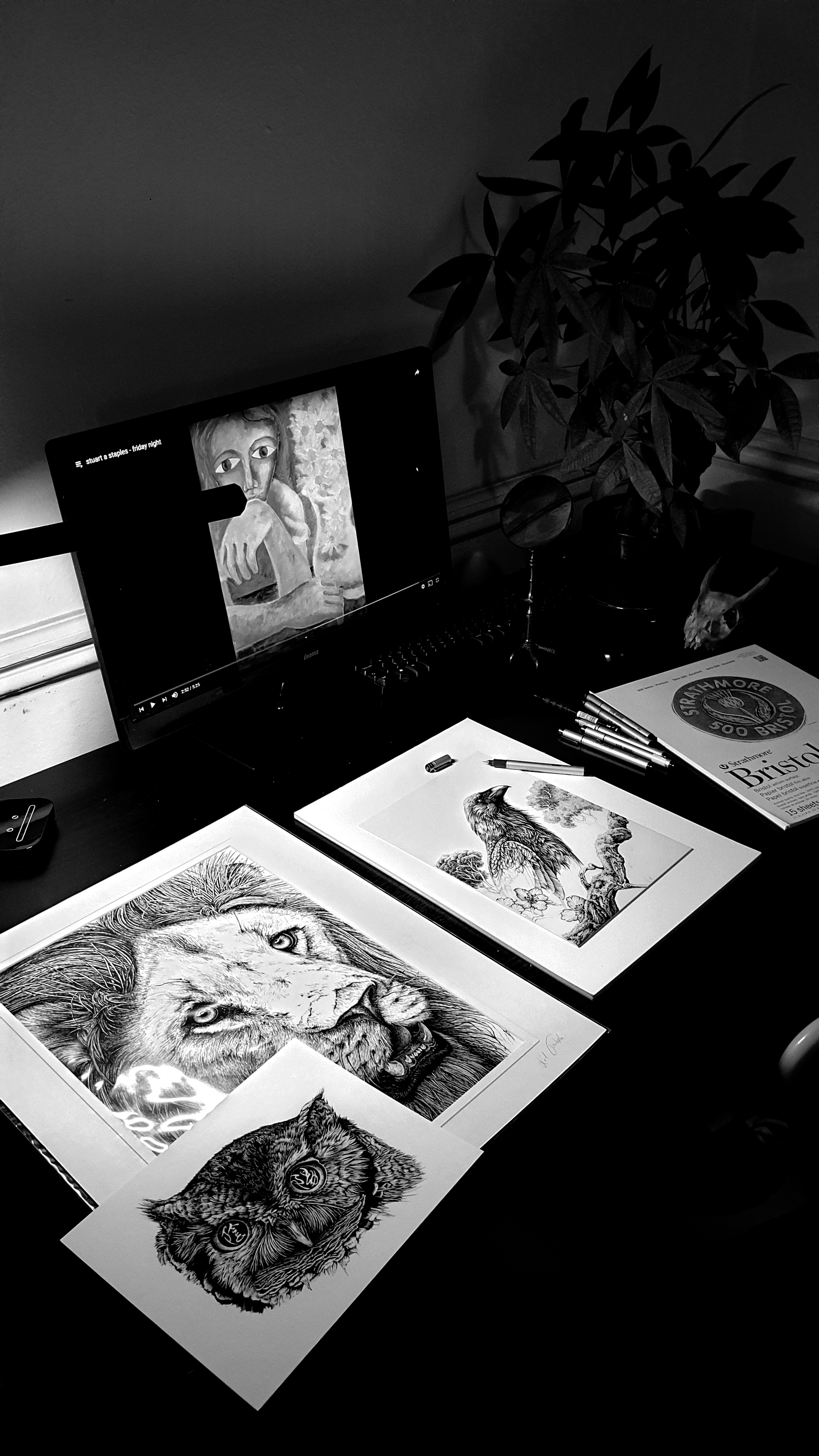 I’ve been drawing since as far back as I can remember. As a child my father used to take us both to wildlife parks, sitting in the car drawing the animals as they roamed. I’ve always had a fascination with wildlife/nature and I guess this was the foundation for my inspiration. I studied illustration at university but hardly ever turned up and was useless in groups and being told what kind of style or what meanings to attach to my art. I’ve always liked tutoring myself, studying the work of great artists of the past such as Gustave Dore and Leonardo da Vinci but I didn’t start drawing in a dedicated fashion until after my 30th birthday and haven’t stopped since.