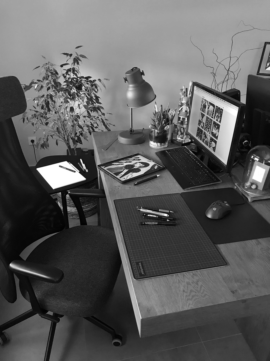 I used to work exclusively traditional but for almost one year now I tend to work more and more digital. To be honest I love both and I really miss drawing on paper and experiment with different mediums.