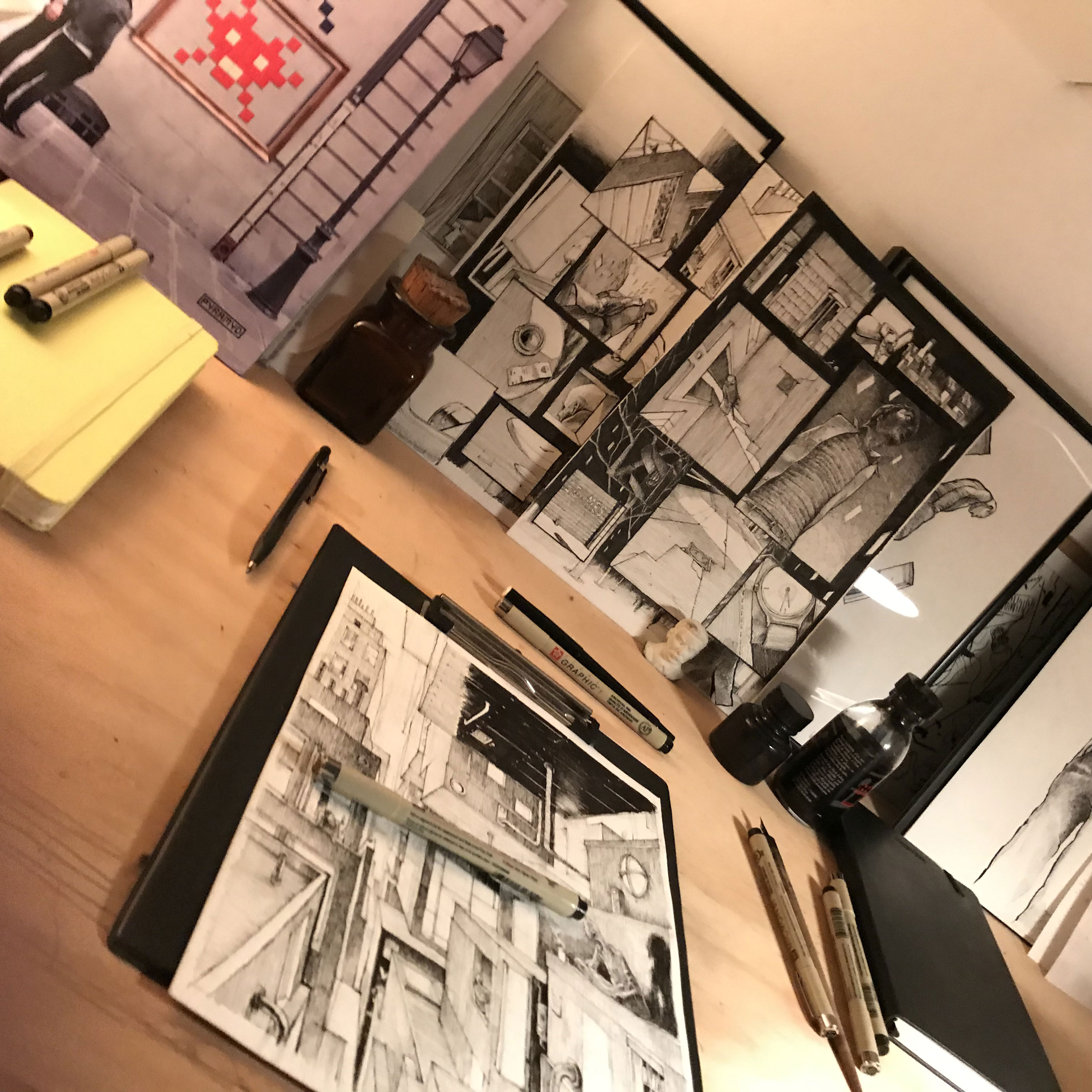 Generally it is while my hand is moving on paper that I find ideas. If I try to find a good idea just staring at the wall, I could stay there for days without finding anything.